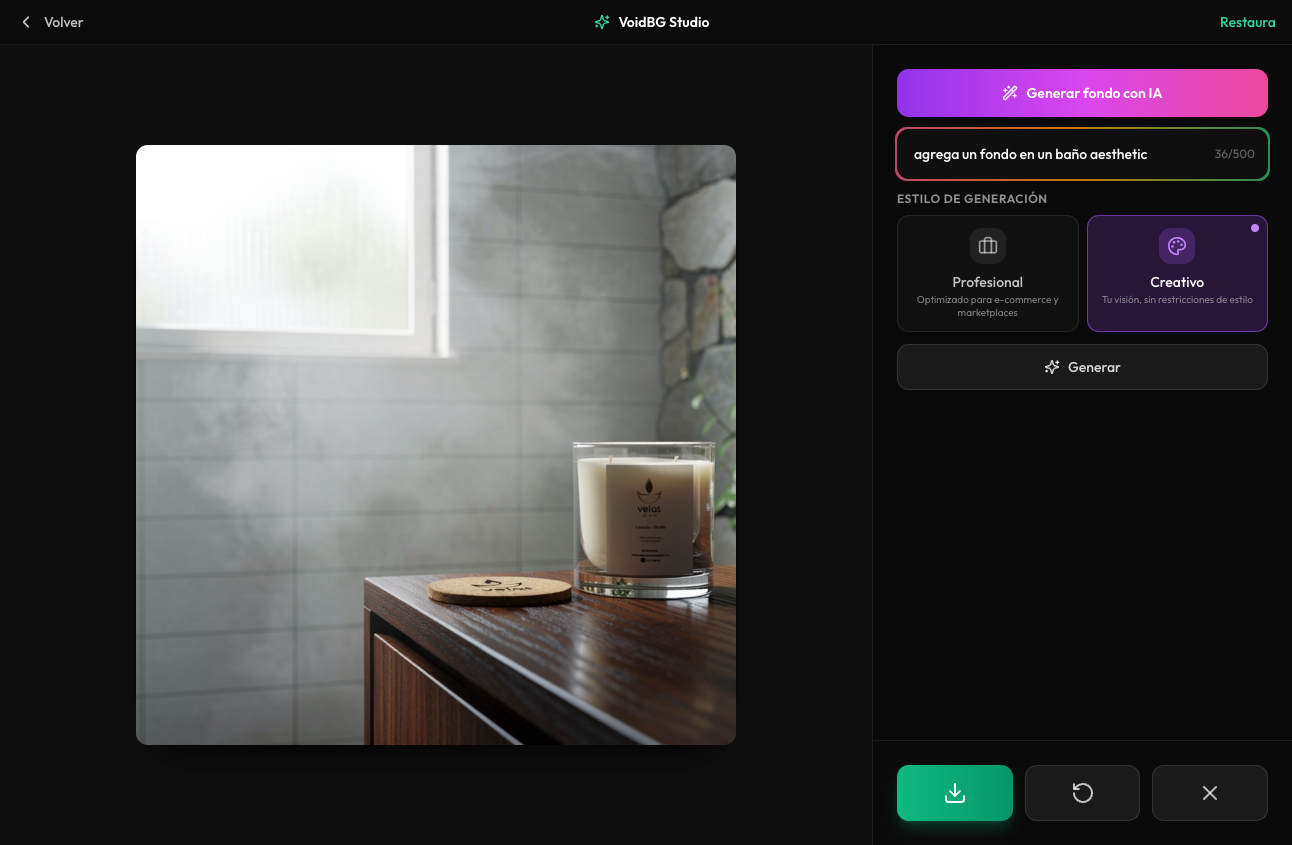 Transforma tus fotos de productos en imágenes profesionales listas para usarlas en tu e-commerce. Añade un fondo creativo a tu estilo con VoidBG Studio.